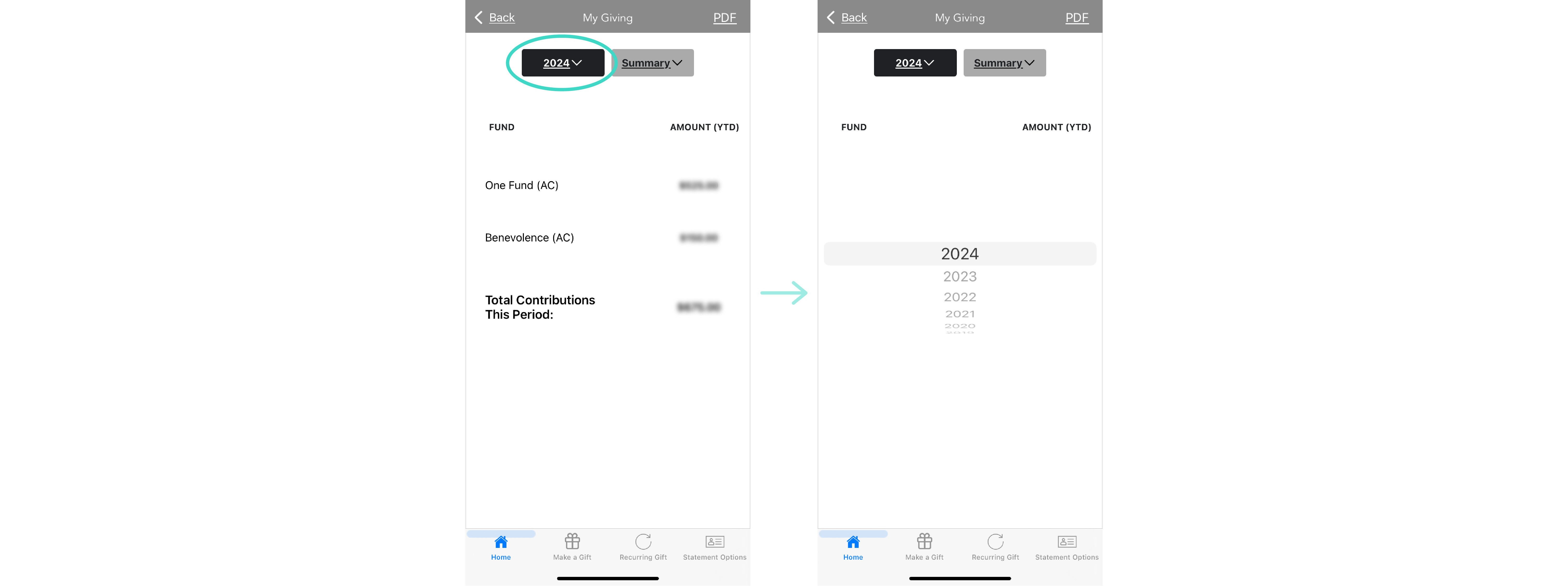 7. Click PDF, to view a PDF version of your giving statement.