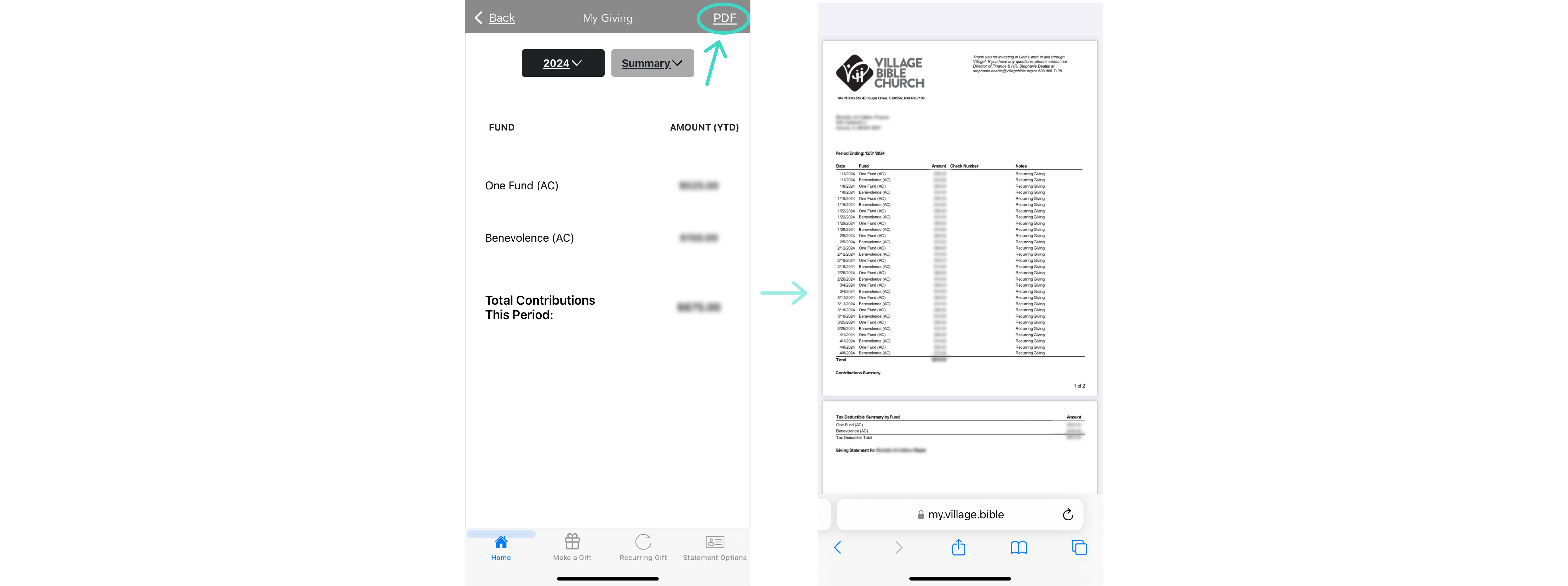 Follow these instructions for viewing a PDF file of your giving statements through our church app or online.